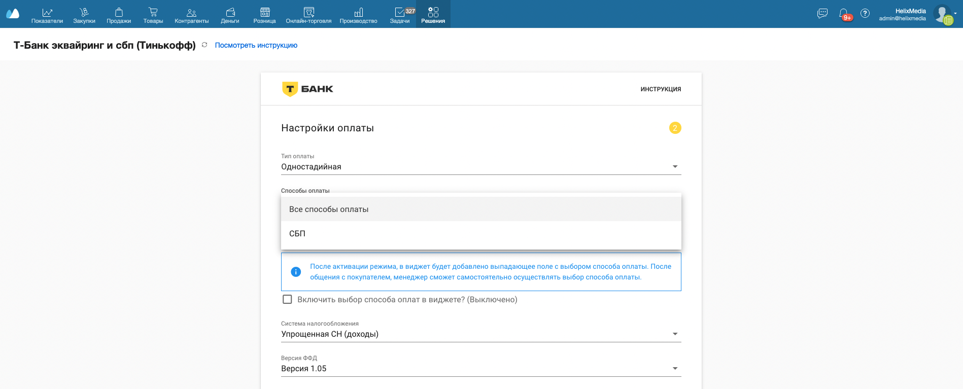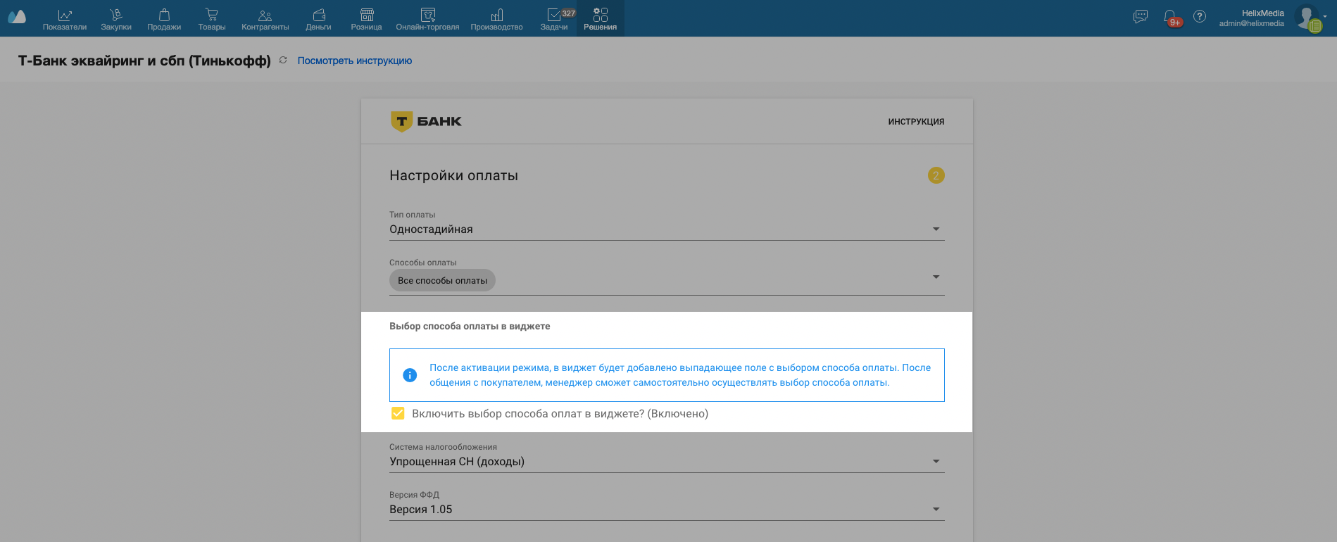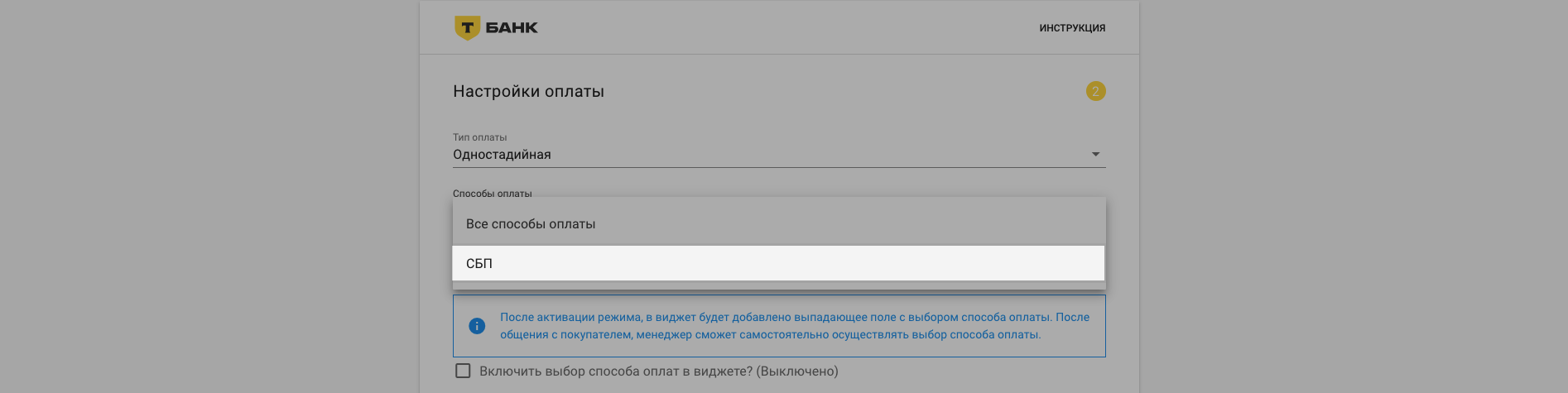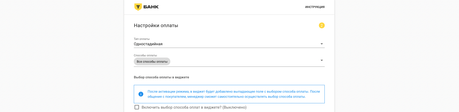 Примечание: на этапе тестирования выбор способа оплаты в виджете недоступен.